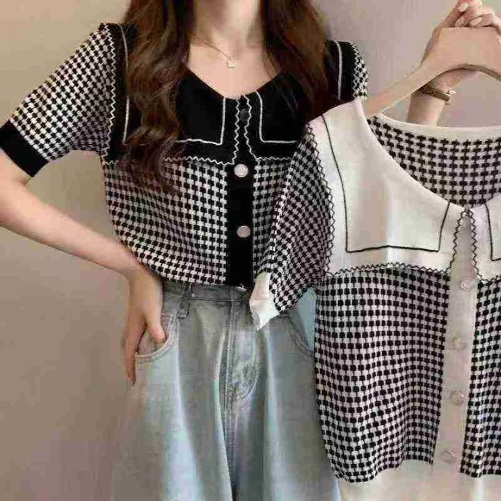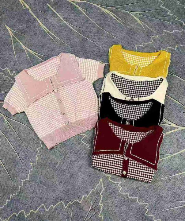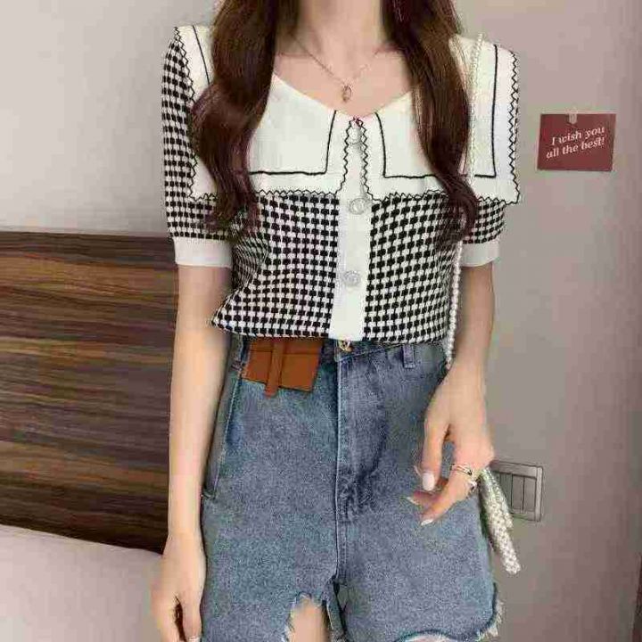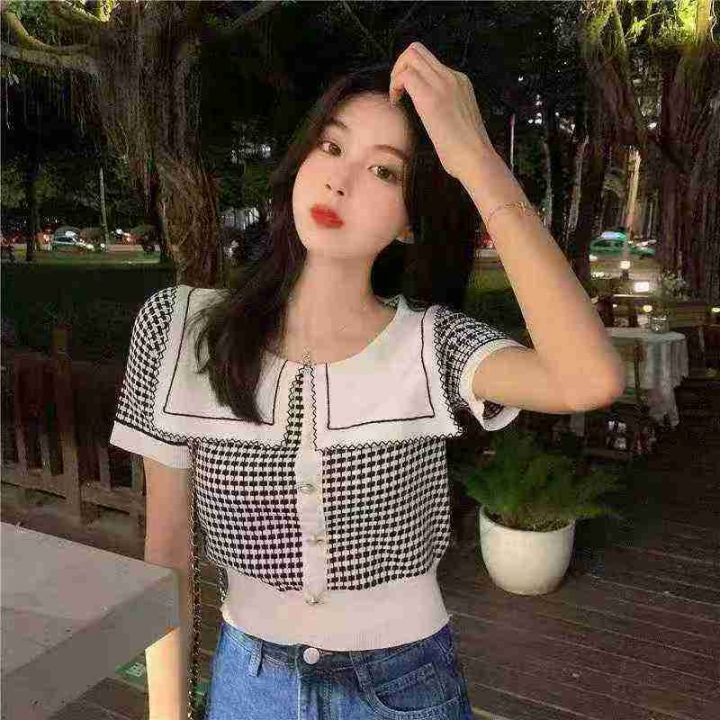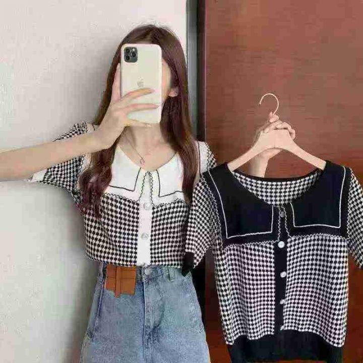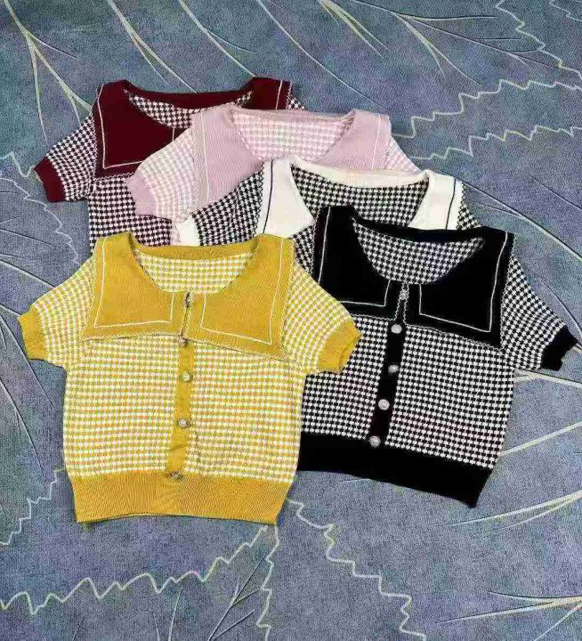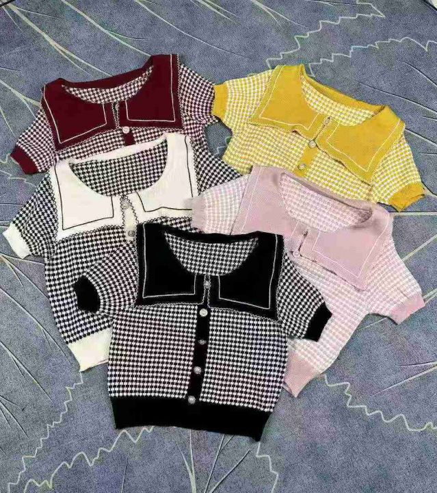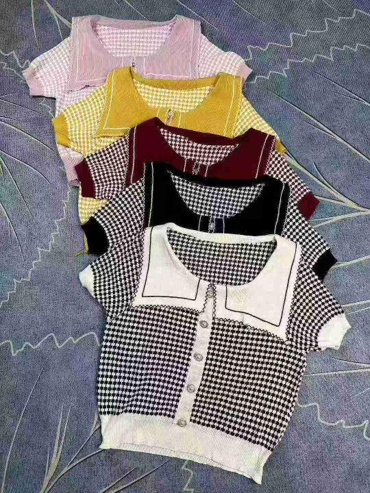 娃娃领套头上衣女夏季设计感短款冰丝减龄小香风针织短袖,独立包装,120件,清7.8