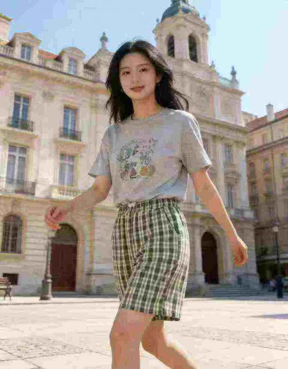 高腰抽绳设计,宽松阔腿格子五分裤版型,裤身有自然垂...
