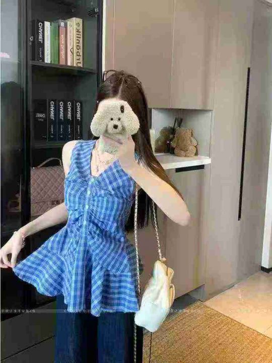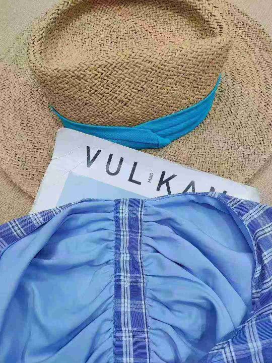 [月亮]:25新款高品韩系复古蓝格辣妹上衣裙