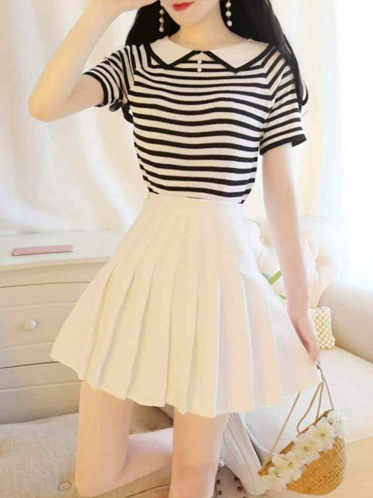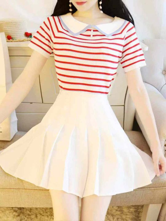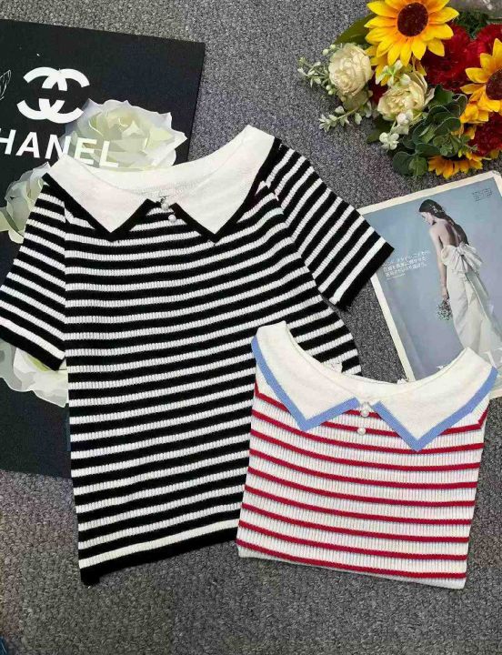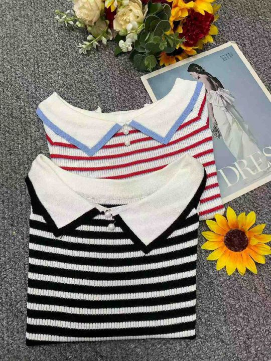 夏季新款撞色条纹韩系娃娃领宽松减龄针织短袖,独立包...