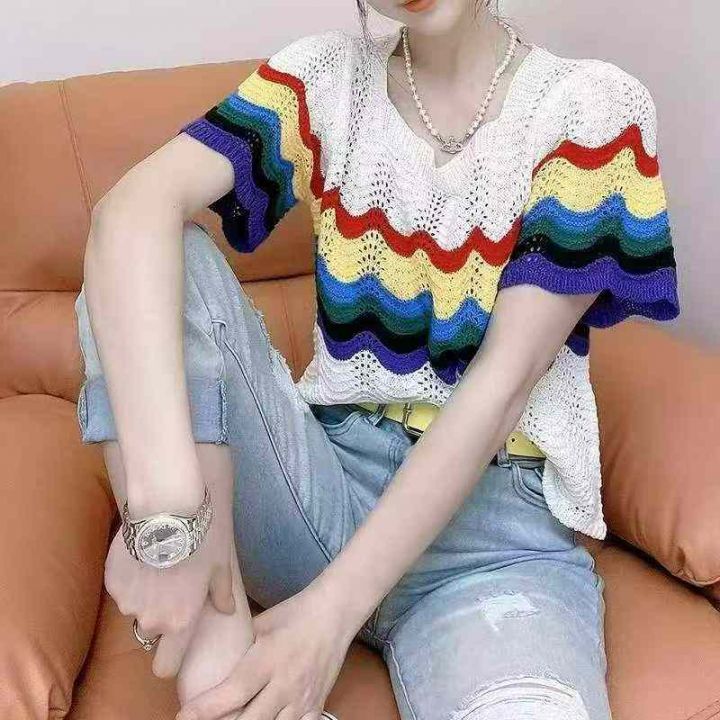 夏季新款彩虹条纹镂空冰丝宽松洋气减龄短款短袖针织小衫,独立包装,均码面...