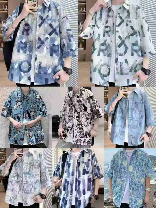 正品独立包装,男夏季复古印花衬衣服男生潮牌痞帅凉感休闲衬衫