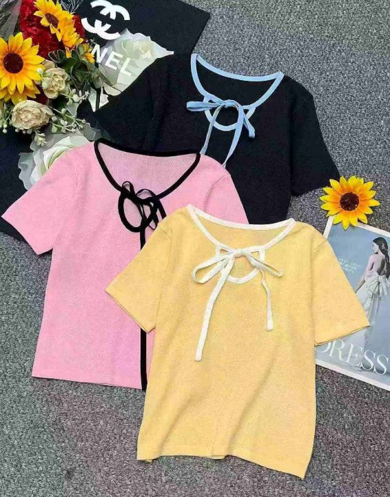 夏季新款港味风格蝴蝶结绑带正肩冰丝针织短袖T恤,独立包装,均码面料柔软...