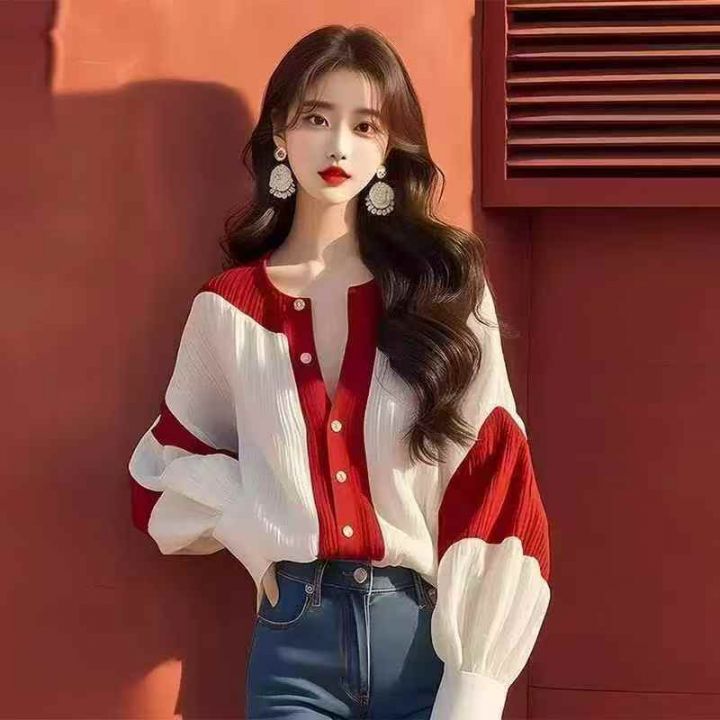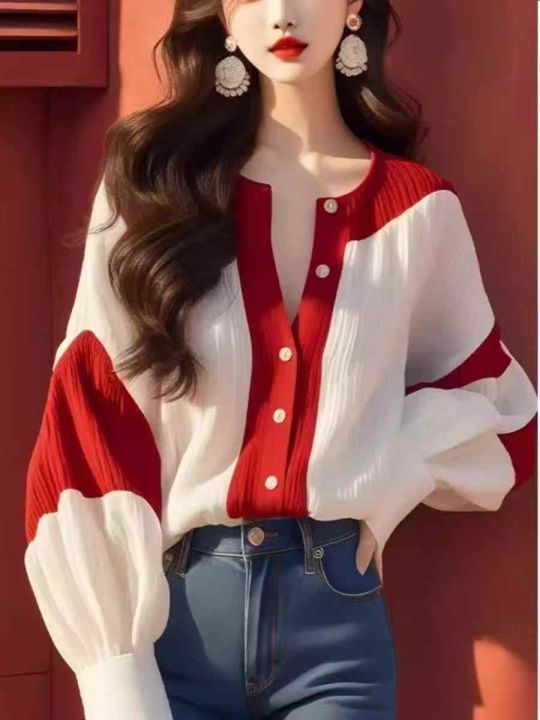 ❄️高级感别致红白撞色灯笼袖网红款雪纺衬衫,单款单...