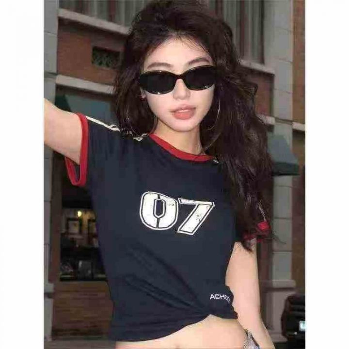 复古插肩撞色两条杠短袖t恤女装夏季辣妹修身正肩设计感小众上衣,数量260件...