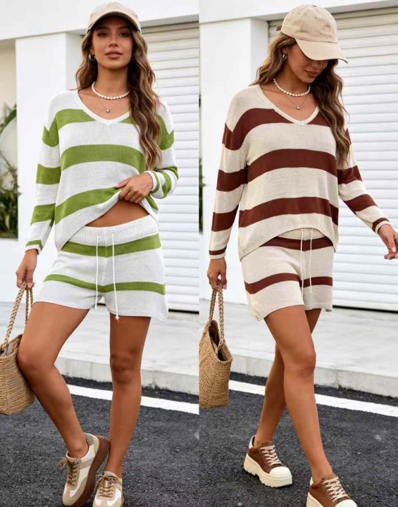 全清价6.898套\'具体点数为准\'长袖薄款时尚百搭条纹针织短裤套装,独立包...