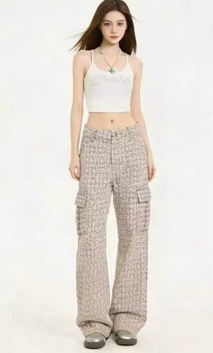 夏季新款设计感提花高腰显瘦气质百搭多袋直筒阔腿工装...