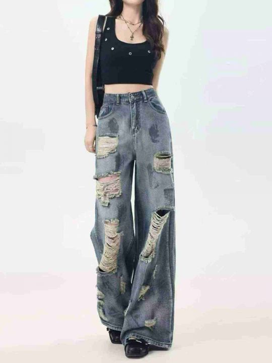 复古扎染废土风破洞女牛仔裤水洗垂感阔腿拖地裤,码数S-XXL,面料舒服柔软...