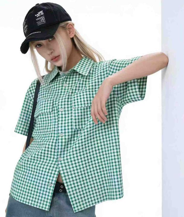 夏季新款宽松韩版百搭设计感小众清新格子衬衫,独立包...