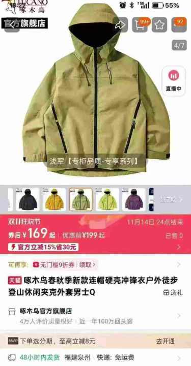 3️⃣天猫在售款啄木鸟同款三防面料男女同款户外软壳冲锋衣900件,单款3色,码数S-XL,独立包装,福建货,工厂订单超时退单,面料成本60多块人工成本20多,质量嘎嘎好,有清单