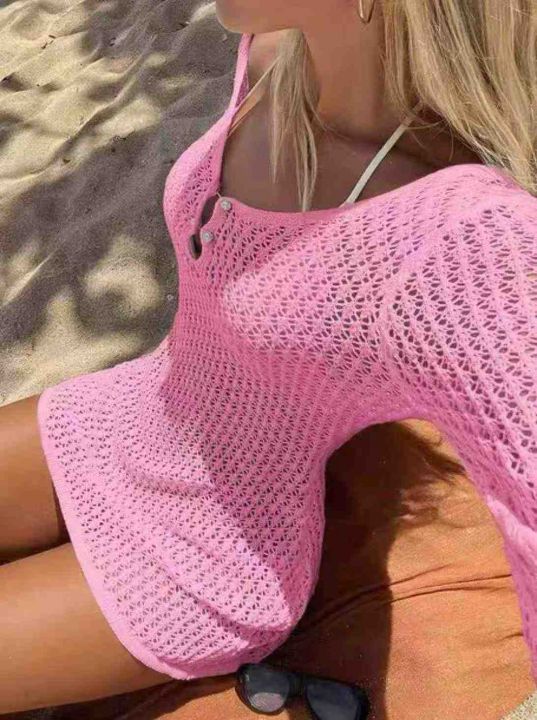 夏季新款欧美原单沙滩包臂性感针织镂空长袖爆款罩衫防...