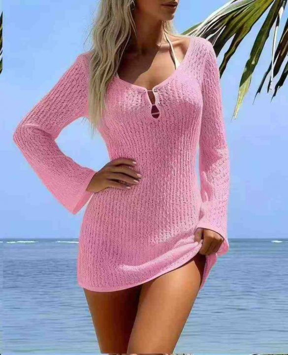 夏季新款欧美原单沙滩包臂性感针织镂空长袖爆款罩衫防晒连衣裙,独立包装,均码面料柔软舒适有弹力,1025件,全清5.9元超低价秒杀!分货加一!