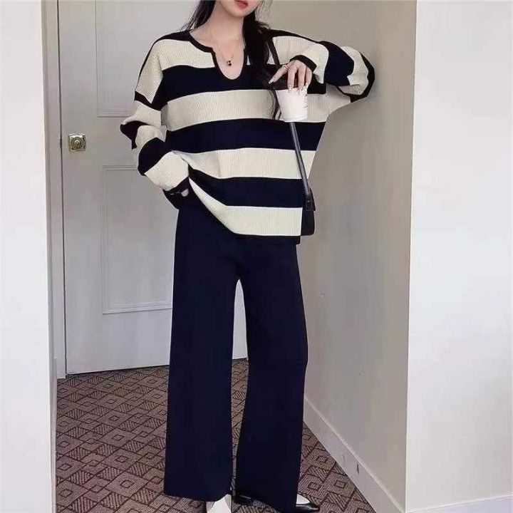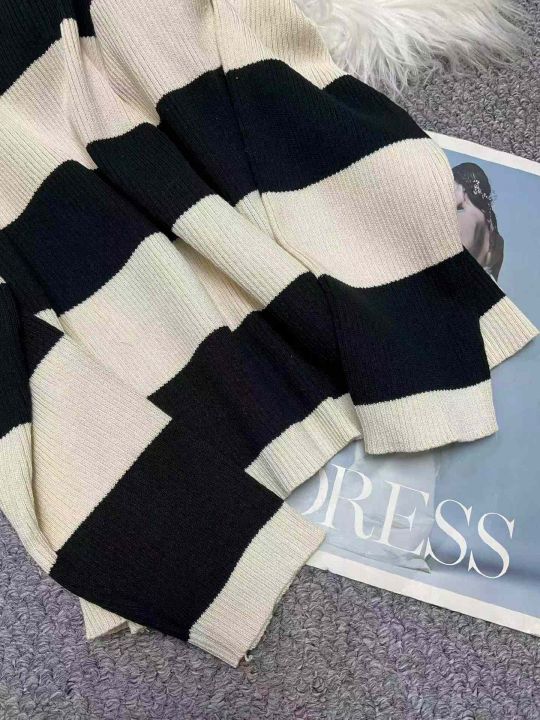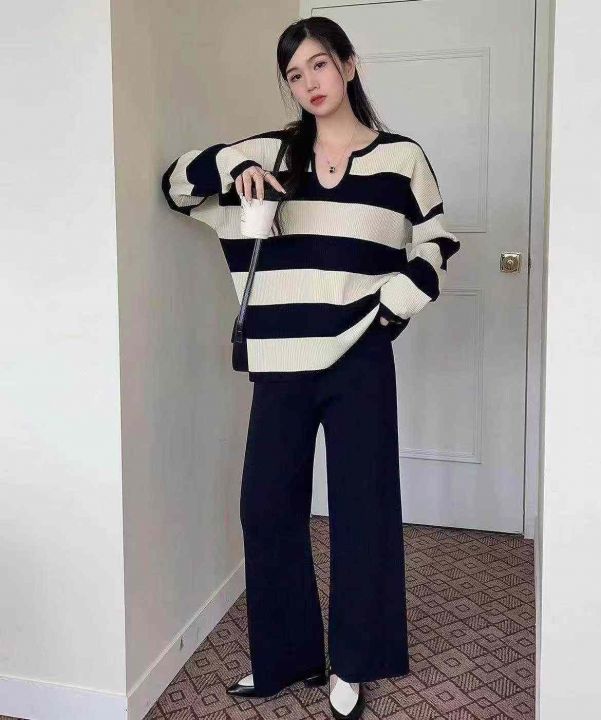 春季新款时尚洋气显瘦韩系撞色条纹宽松百搭套头毛衣,...