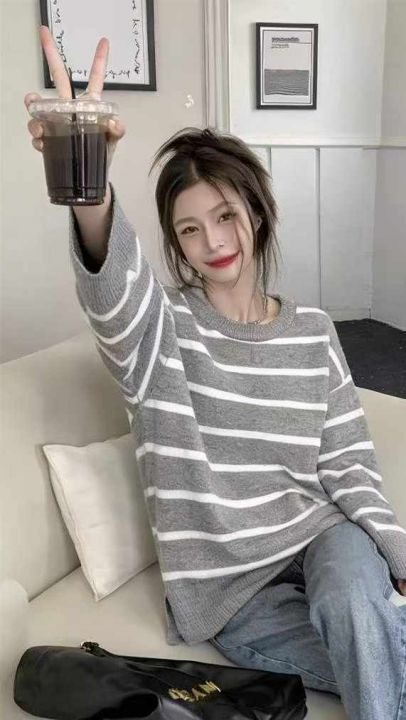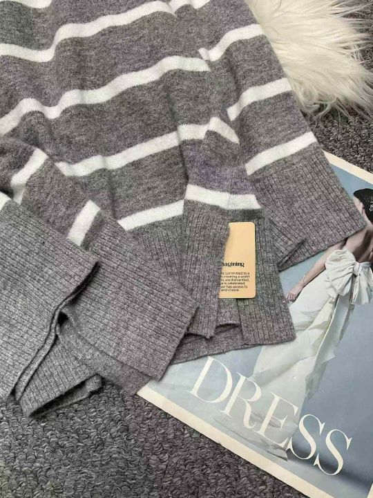 春季新款品牌原单撞色条纹宽松落肩圆领套头毛衣,独立...
