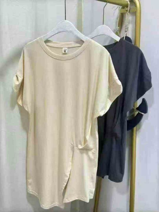 纯棉180-220克大码百搭褶皱收腰短袖T恤女2025夏季新款不规则下摆显瘦上衣打...