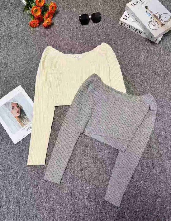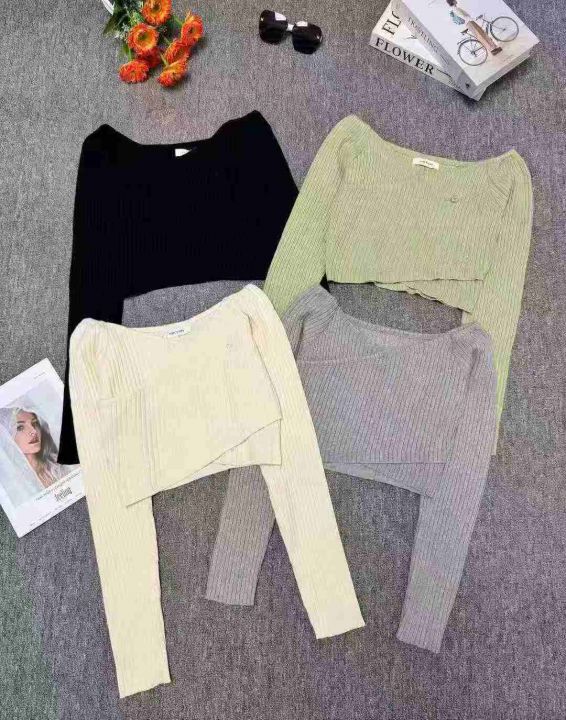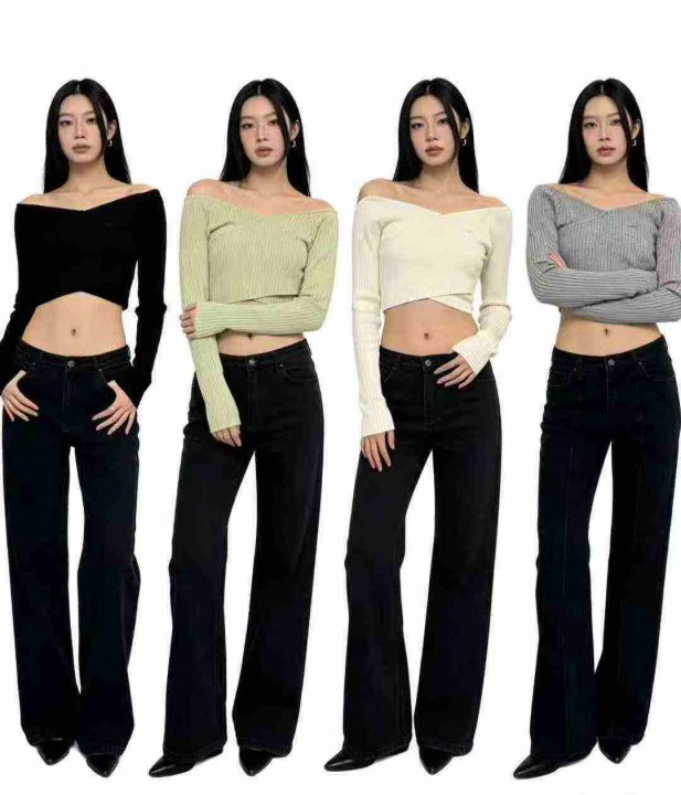 176件 靓妹交叉罗纹露肩短款针织衫上衣,整款四色,有独立包装 5.9 清
