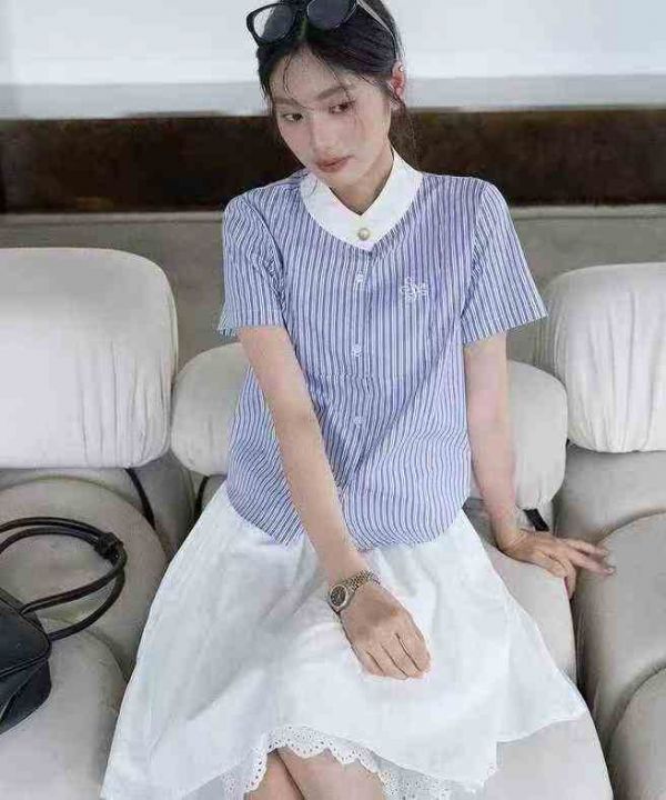 蓝色条纹短袖衬衫164件7.9,撞色拼接,后领包边,图案...