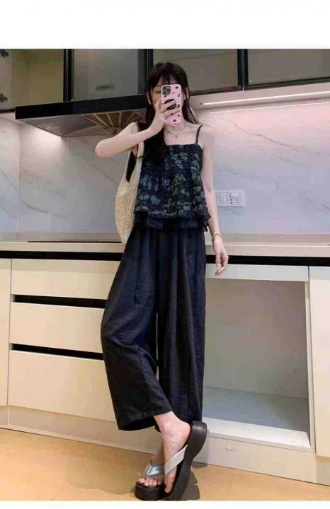 山本阔腿裤女夏季薄款高腰宽松卷边小个子九分直筒裤,...