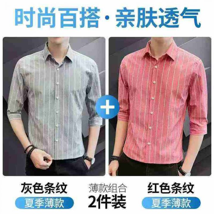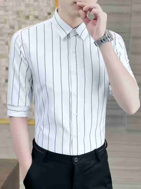 2026夏季新款中袖衬衫男修身韩版条纹衬衣帅气百搭短袖...