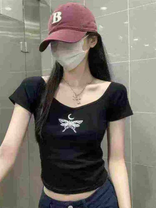 ☕️美式复古辣妹纯欲夏季修身方领辣妹蝴蝶印花纯棉短袖T恤500件全清8.8元 ...