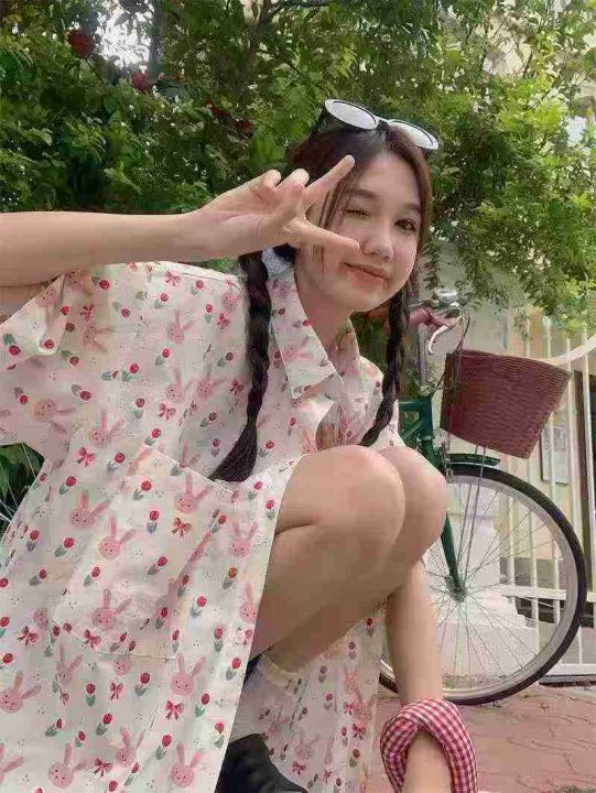 [月亮]:8.5清189件(不分货)[月亮]:港味甜美兔子满印宽松短袖衬衫[月亮]...
