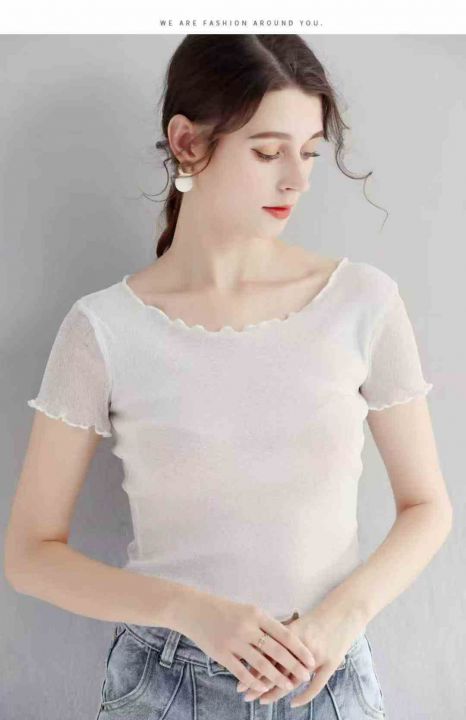 285件短款木耳边网纱打底衫女短袖内搭纱衣圆领新款亮...