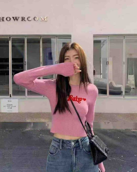秋季新品纯欲甜辣短款字母刺绣针织长袖圆领套头毛衣,...