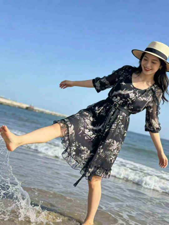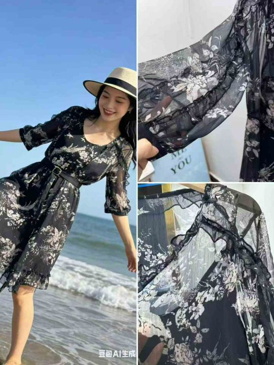 黑色雪纺碎花吊带两件套连衣裙数量:86条 码数:S-XL,独立包装(货号319#25)