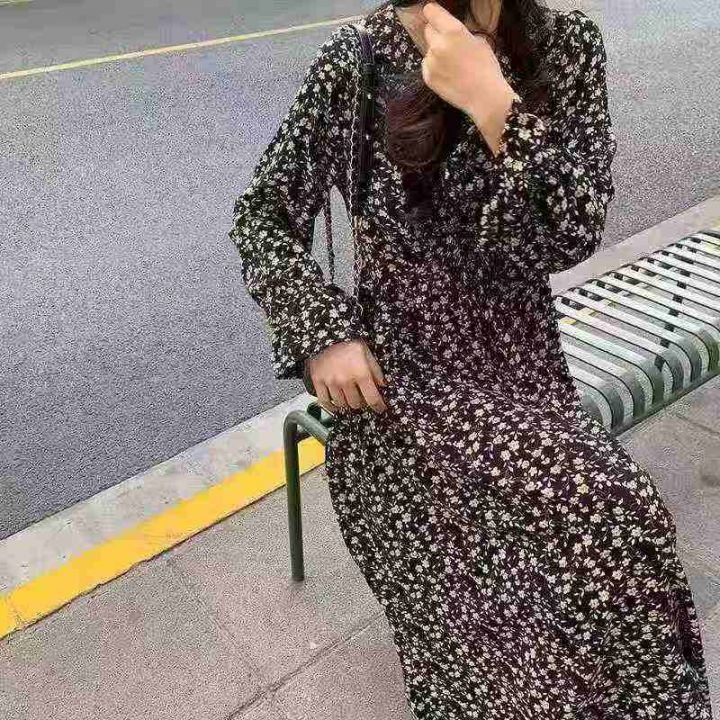 ☕️法式雪纺碎花长袖连衣裙女秋冬新款中长款收腰法式...