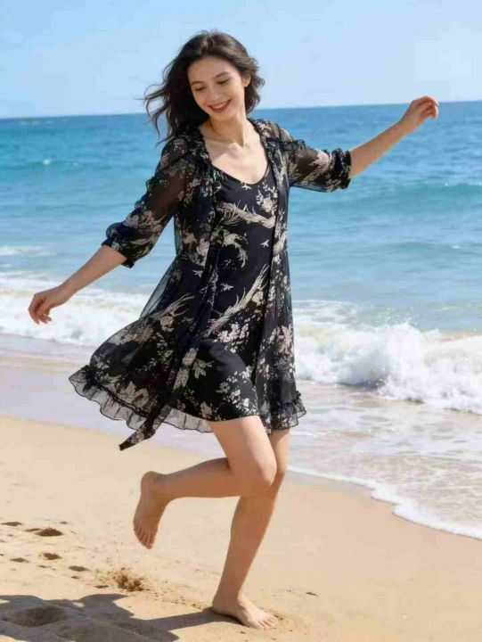 黑色雪纺碎花吊带两件套连衣裙数量:86条 码数:S-XL,独立包装(货号319#25)