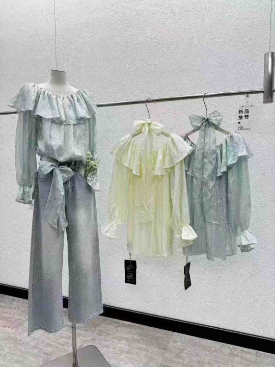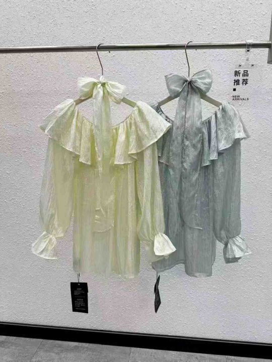 双层荷叶边+飘带蝴蝶结,系上温柔仙气,解开纯欲撩人,一衣两穿!面料清透不闷,奶黄/浅蓝双色系,显白又减龄。喇叭袖藏肉显瘦,春夏搭牛仔裤、半裙都超绝,实体店/直播爆单款,数量不多!