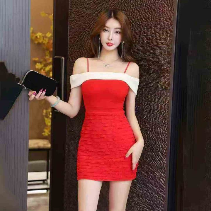 74条韩版一字肩性感吊带晚礼服包臀短款低胸气质高端名...