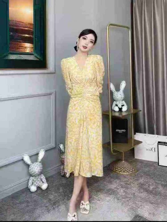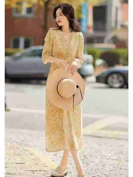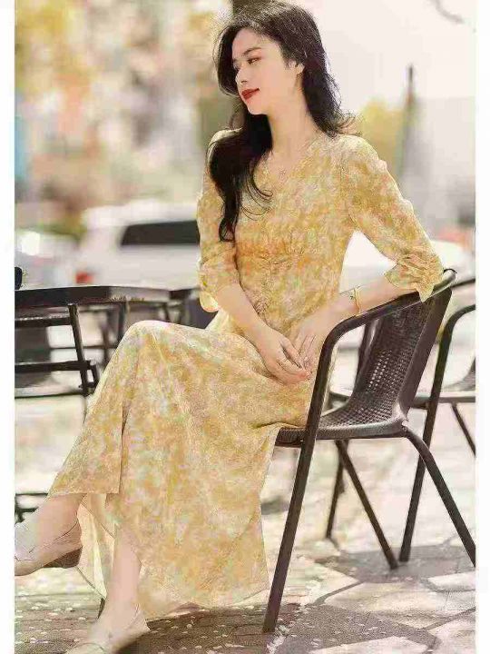 茶歇法式黄色V领碎花连衣裙女夏气质优雅温柔风修身收腰长裙