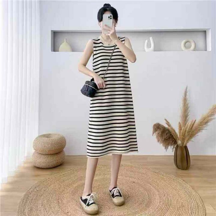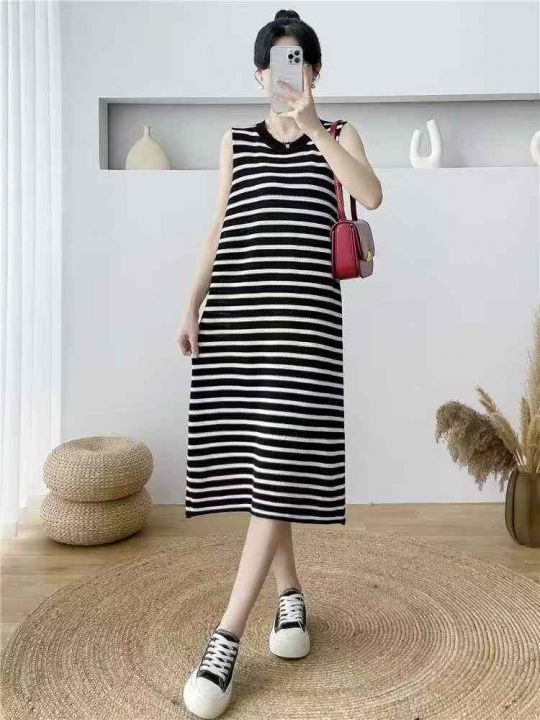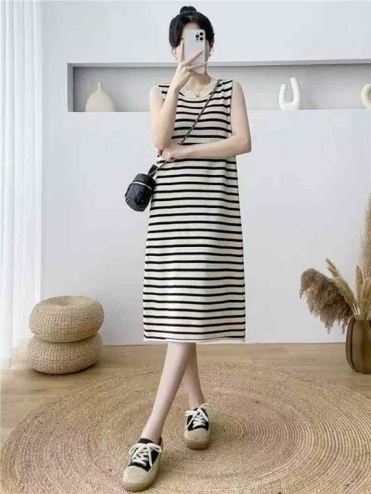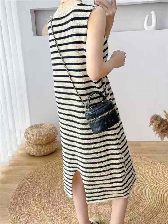 春夏季新款法式无袖气质显瘦长裙条纹开叉针织背心连衣...
