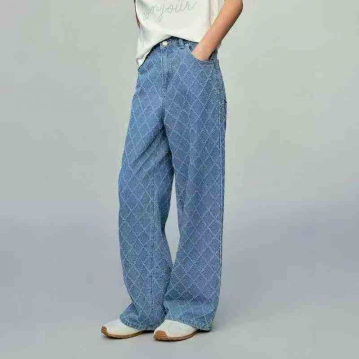 新款菱格设计感高腰牛仔裤女宽松显瘦百搭直筒阔腿长裤...