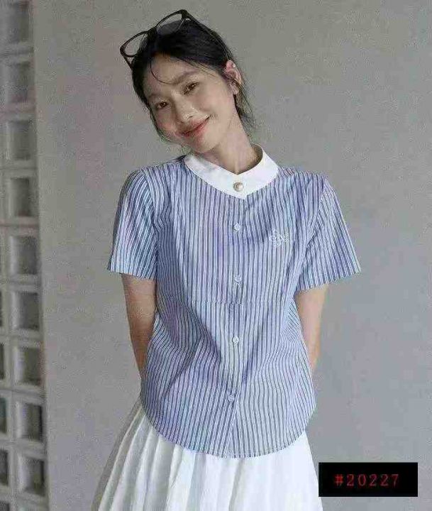 蓝色条纹短袖衬衫164件7.9,撞色拼接,后领包边,图案...