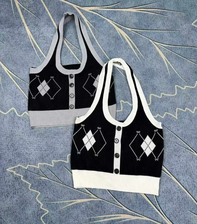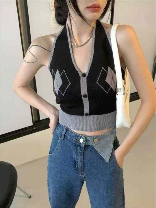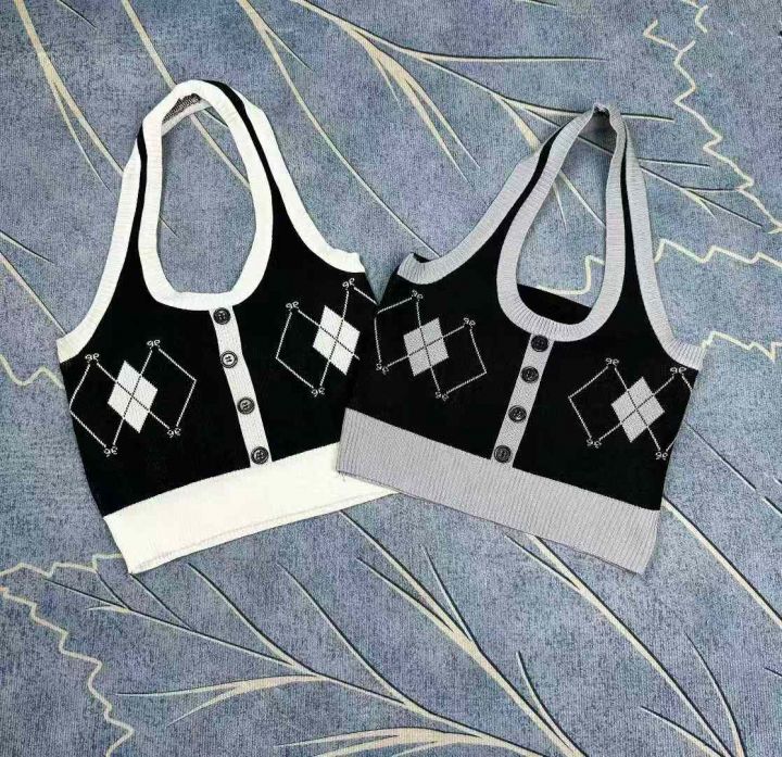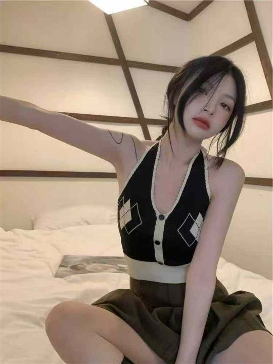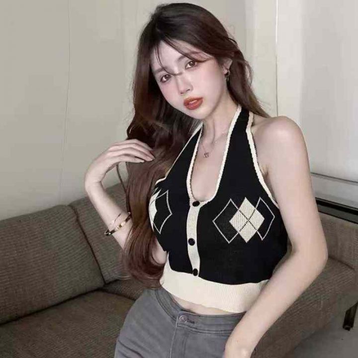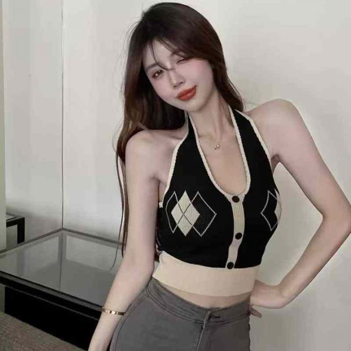 菱格挂脖吊带背心女装修身内搭夏季短款辣妹外穿露背针织无袖上衣,独立包装,350件,清4.5,分➕1