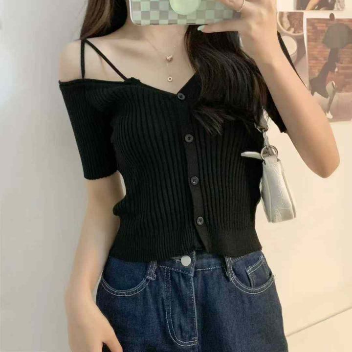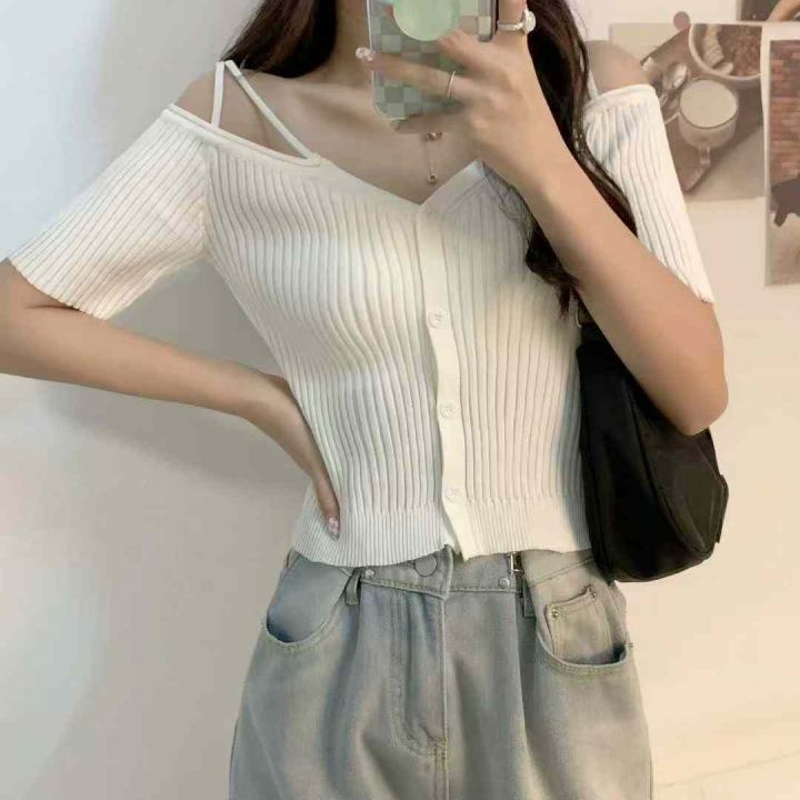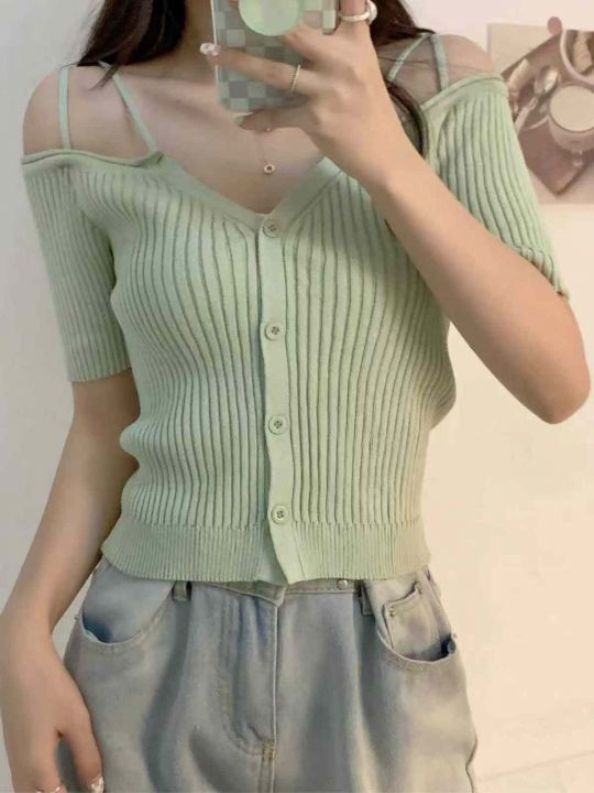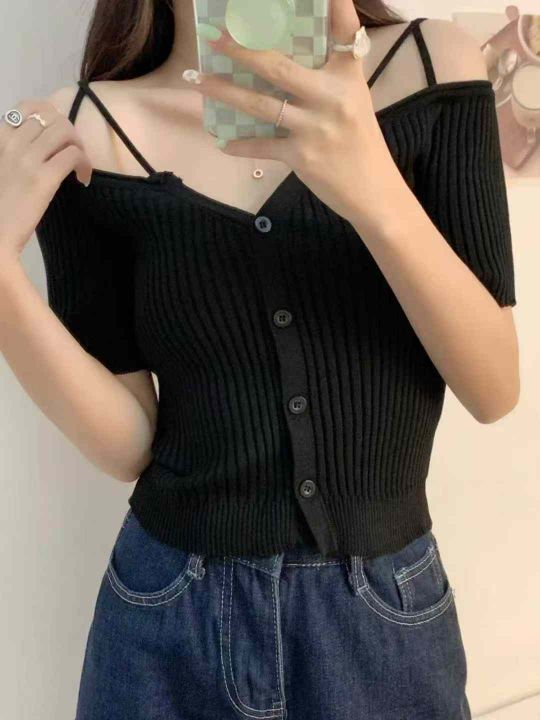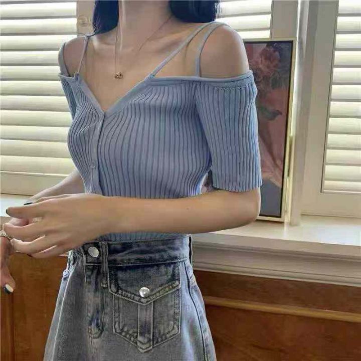 法式一字肩v领短袖夏纯欲冰丝针织吊带露肩短款冰丝上...