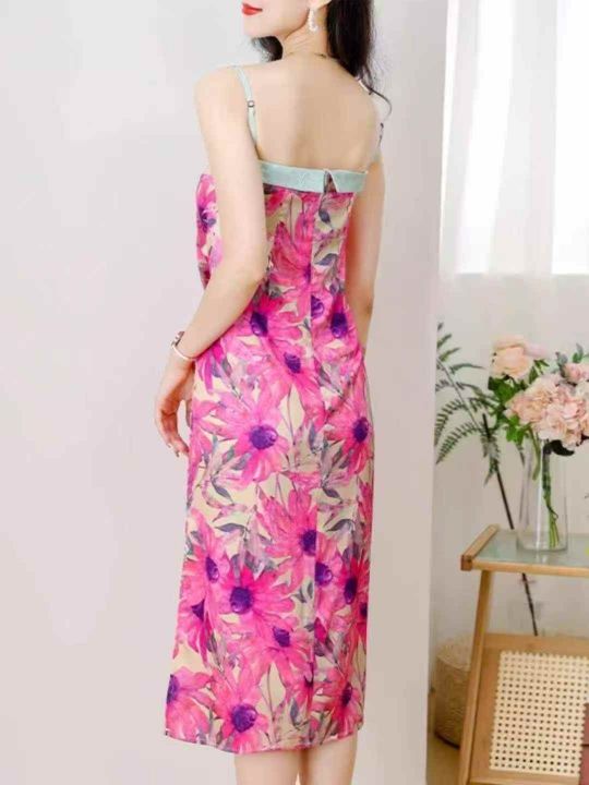 法式复古碎花拼接吊带连衣裙女士夏季新款气质修身高端...