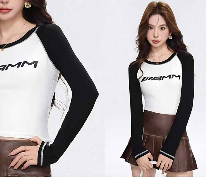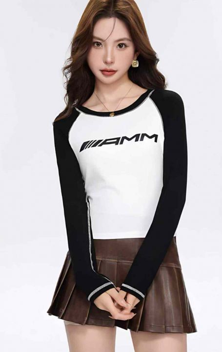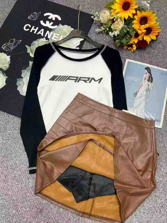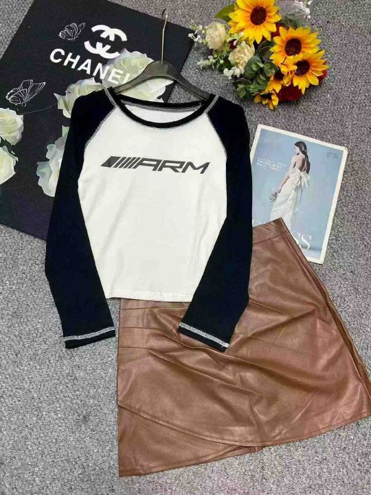 夏季新款撞色复古插肩袖印花美式弹力修身正肩辣妹长袖t恤+美拉德色系皮短裙2件套,独立包装,码数M--XL码, 100套左右,全清5.9元超低价秒杀!