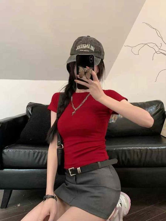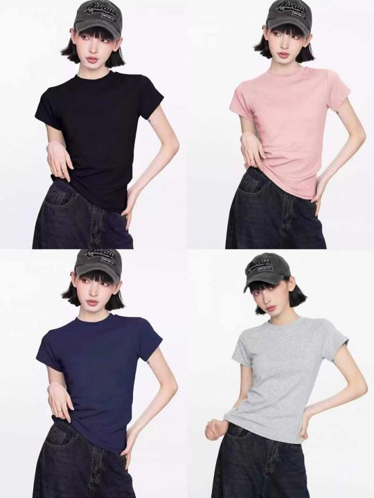 ☕️辣妹纯棉T恤圆领正肩短袖t恤女夏短款修身纯色显瘦...