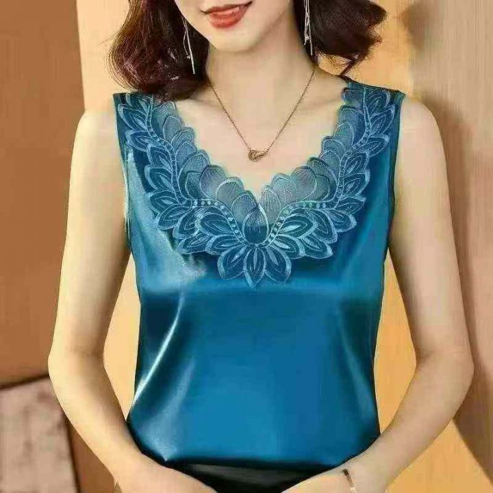 夏季高级感背心女装蕾丝百搭大码显瘦纯色绸缎吊带上衣...
