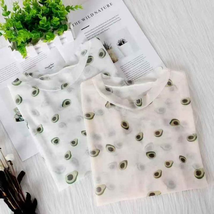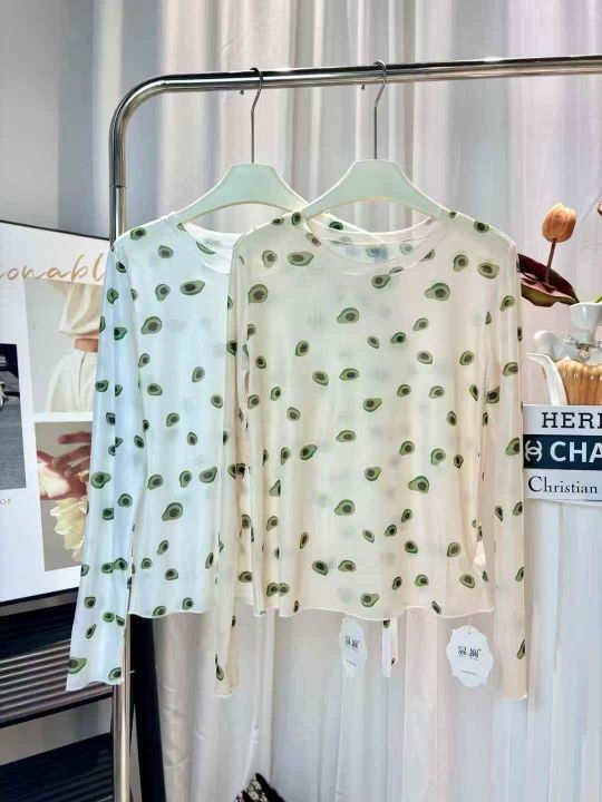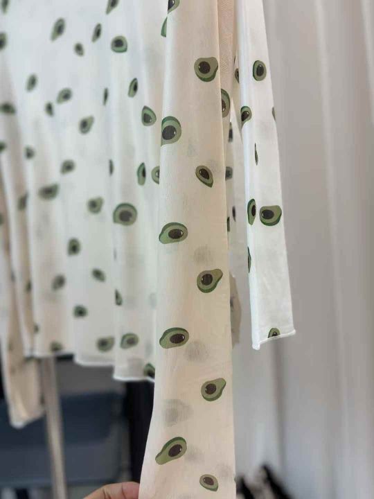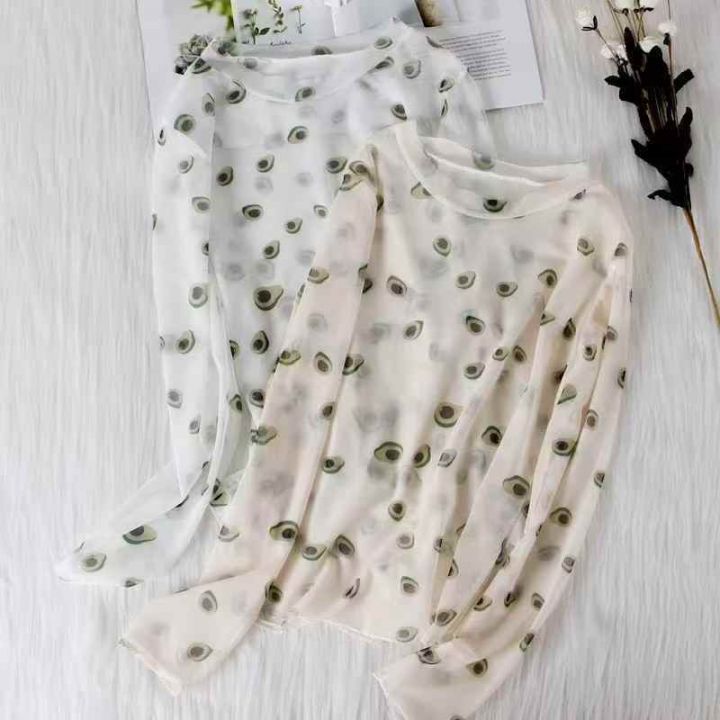 135件牛油果绿印花冰丝打底衫女内搭上衣性透视网纱防...