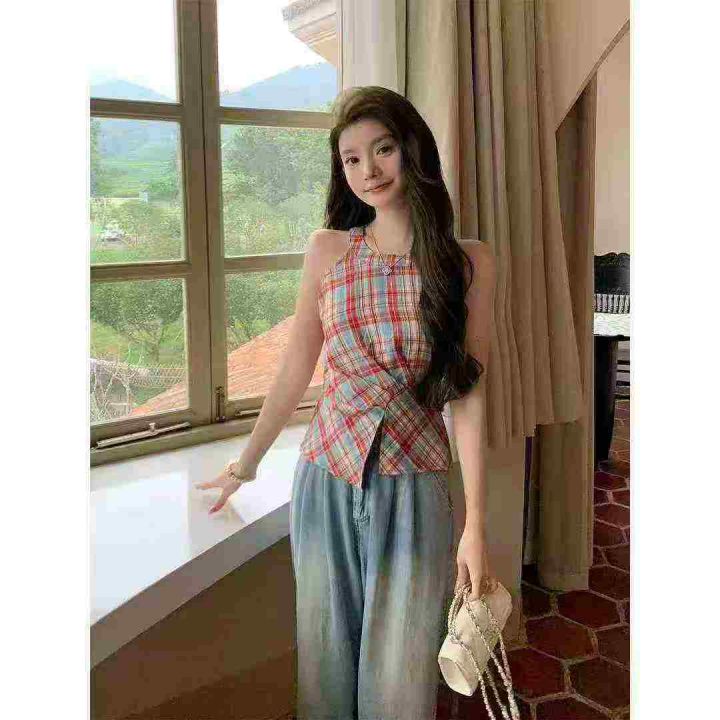 复古撞色格子挂脖收腰设计感上衣,[爱心]80件左右,单款单色,款号#1499,码数S-L,穿70-120斤,万佳档口货,原包装️无瑕疵,[666]实体店品质