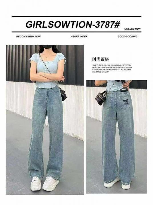 网红款简约复古刺绣直筒牛仔裤女高腰宽松显瘦拖地阔腿...