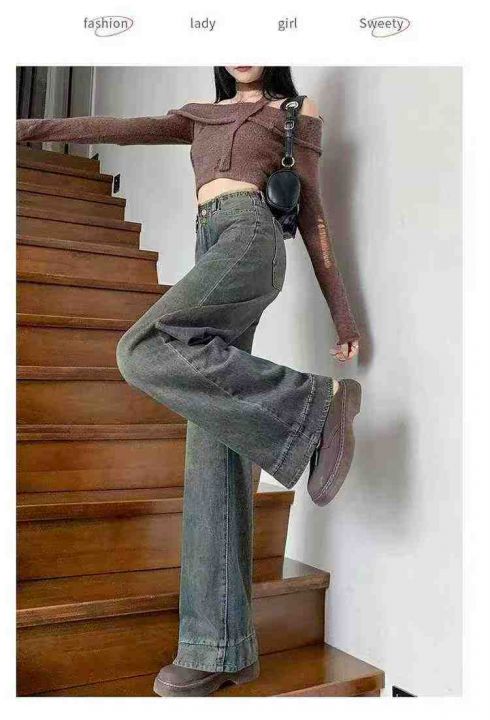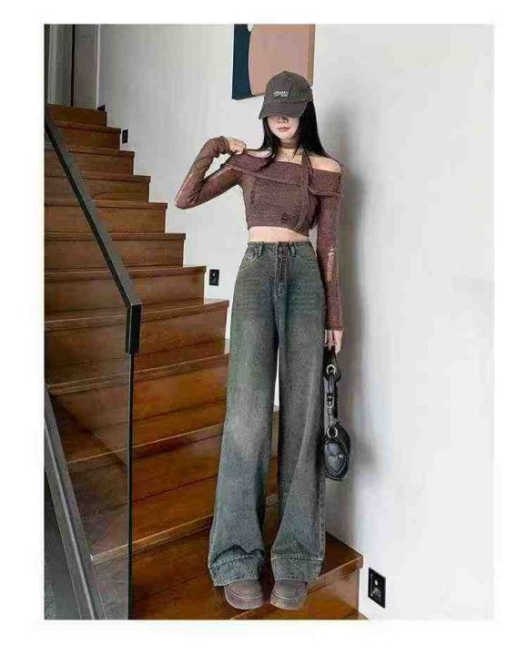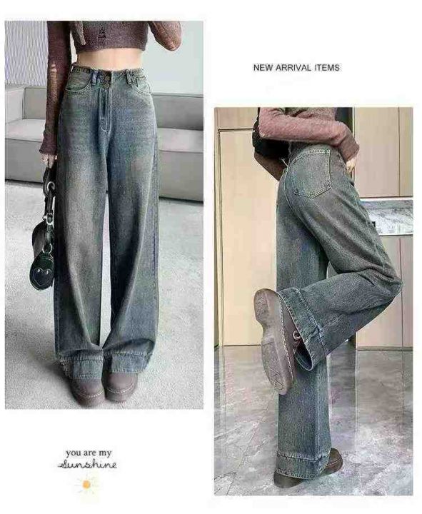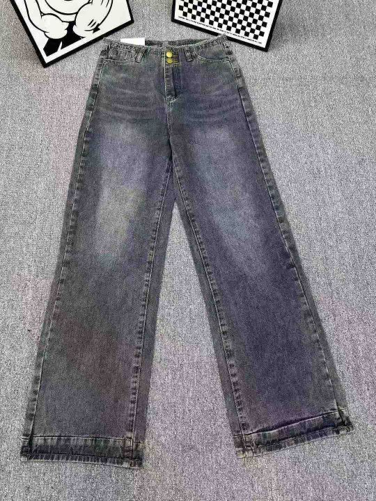 美式复古水泥灰直筒牛仔裤女高腰宽松垂感阔腿裤子,单...