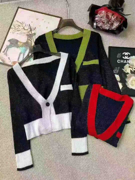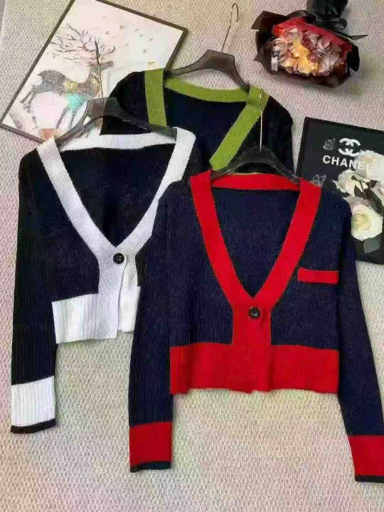 春秋新款V领拼色韩版小香风一粒扣针织毛衣开衫,独立...