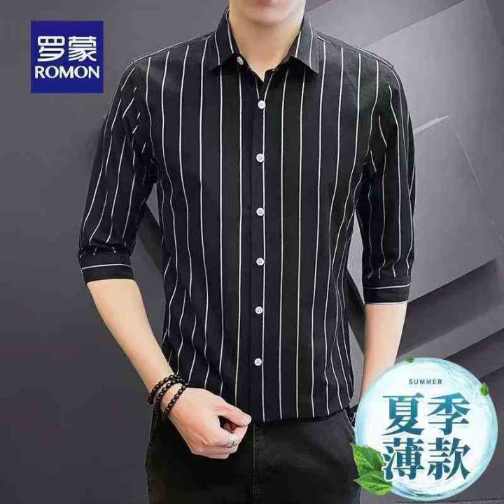 高端男士休闲中袖衬衫夏季冰丝雪纺韩版潮流修身大条纹...