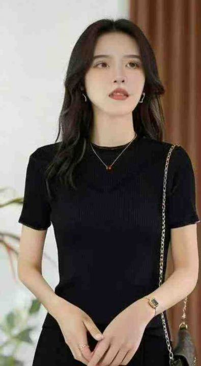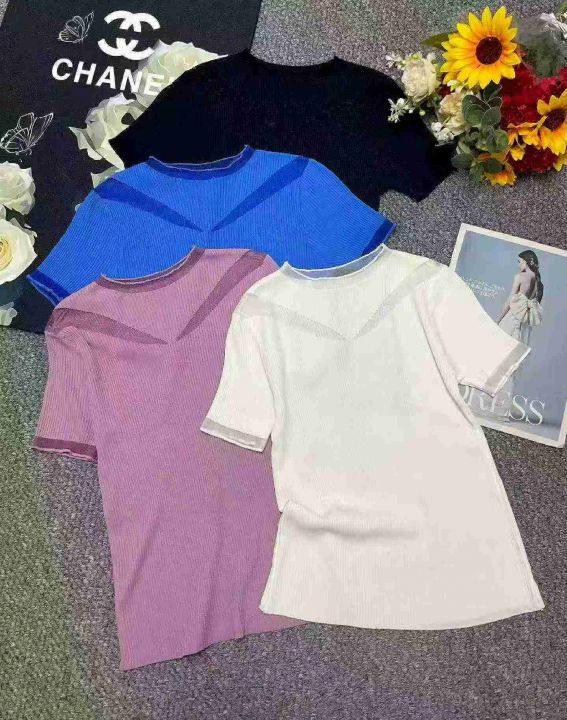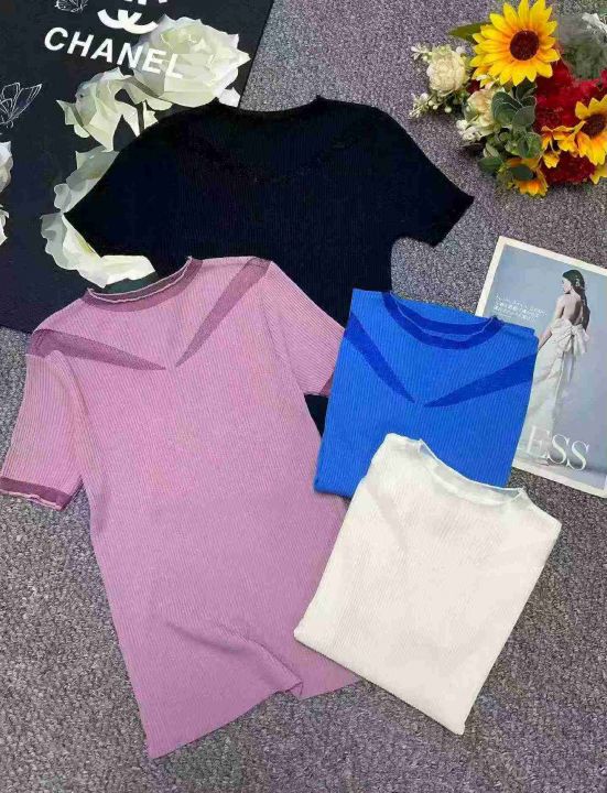 夏季新款蕾丝拼接弹力修身显瘦短袖针织衫,独立包装,...