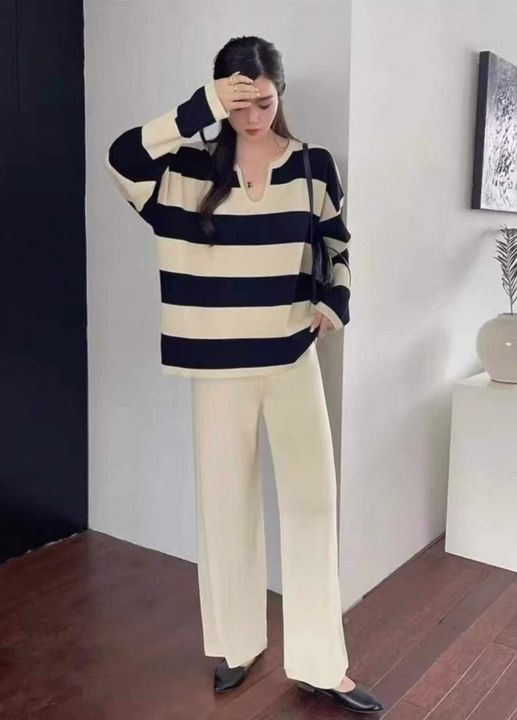 春季新款时尚洋气显瘦韩系撞色条纹宽松百搭套头毛衣,...